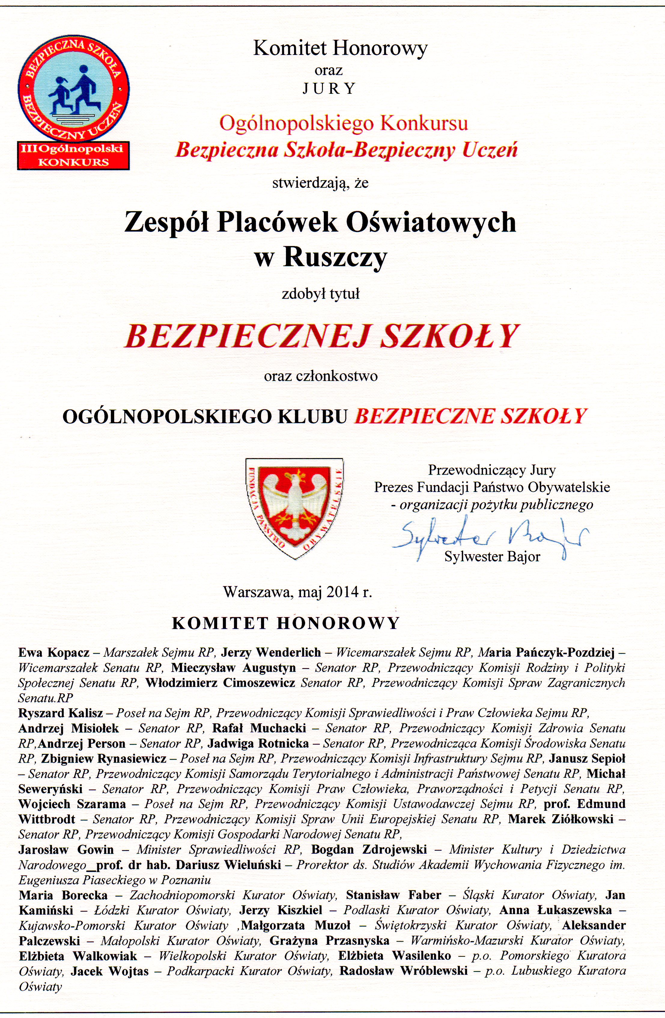 W roku szkolnym 2013/2014 Zespół Placówek Oświatowych w Ruszczy przystąpił do Ogólnopolskiego Konkursu ,, Bezpieczna Szkoła- Bezpieczny Uczeń”, który realizowany był w okresie od 20 listopada 2013 roku do 15 czerwca 2014 roku. Konkurs służył podniesieniu poziomu bezpieczeństwa uczniów naszej szkoły. Celem konkursu było również spopularyzowanie wśród uczniów podstawowych zasad funkcjonowania państwa, poszanowanie praw jednostki, w tym ucznia- obywatela, przeciwdziałanie patologiom, tolerancji wobec ludzi o odmiennej kulturze i obyczajach. Realizacja zadań konkursu ,, Bezpieczna Szkoła- Bezpieczny Uczeń” przebiegała pod hasłem ,, Prawo, Przyjaźń, Tolerancja” pod patronatem Redakcji Miesięcznika ,, Perspektywy Europejskie” i Fundacji Państwo Obywatelskie. Udział szkoły w konkursie pozwolił uczniom poszerzyć wiedzę w zakresie zaproponowanym przez organizatorów. Przez cały czas trwania konkursu towarzyszyły mam hasła ,, Prawo, Przyjaźń, Tolerancja”, które wraz z innymi terminami, ważnymi dla społeczeństwa obywatelskiego i solidaryzmu społecznego, utrwaliły się w świadomości uczniów. Jesteśmy przekonani, że działania, podjęte dzięki realizacji poszczególnych zadań konkursowych, podniosły poziom bezpieczeństwa w szkole oraz pozytywnie wpłynęły na poszanowanie praw jednostki.