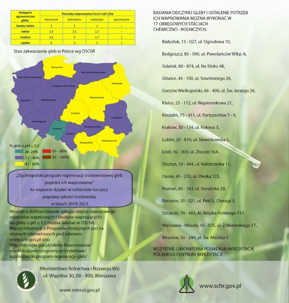 Krajowy Ośrodek Wsparcia Rolnictwa Oddział Terenowy w Kielcach, przesyła ulotkę opracowaną i udostępnioną przez Ministerstwo Rolnictwa i Rozwoju Wsi wraz z Krajowa Stacją Chemiczno-Rolniczą pt.: ,,Rolnictwo dla środowiska środowisko dla rolnictwa''. Ulotka przedstawia problem zakwaszenia gleb i jego skutki dla środowiska oraz przypomina o Ogólnopolskim programie regeneracji środowiskowej gleb poprzez ich wapnowanie. Jednocześnie KOWR OT w Kielcach w celu dotarcia do jak najszerszej grupy zainteresowanych zwraca się