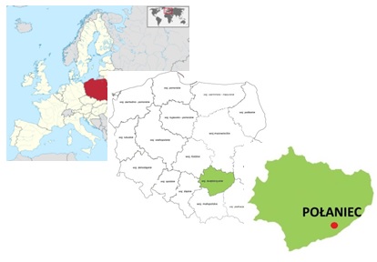 P O Ł A N I E C to miasteczko położone w południowo- wschodniej części woj. Świętokrzyskiego, w powiecie staszowskim. Granicę gminy od wschodu stanowi rzeka Wisła, zaś od północy i zachodu kompleks Lasów Golejowskich. Gmina znajduje się we wschodniej części Niecki Połanieckiej, będącej częścią Kotliny Sandomierskiej. Połaniec położony jest przy drodze krajowej nr 79 na trasie Kraków – Sandomierz oraz drodze wojewódzkiej nr 764 na trasie Kielce – Rzeszów, prowadzącej w stronę autostrady A4 oddalonej od Połańca o ok. 60 km