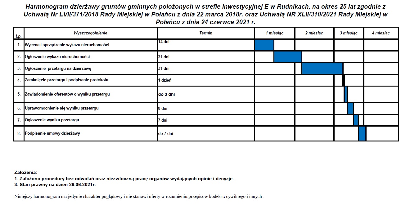1. Harmonogram dzierżawy gruntów gminnych położonych w strefie inwestycyjnej E w Rudnikach, na okres 25 lat zgodnie z Uchwałą Nr LVII/371/2018 Rady Miejskiej w Połańcu z dnia 22 marca 2018r. oraz Uchwałą NR XLII/310/2021 Rady Miejskiej w Połańcu z dnia 24 czerwca 2021 r..