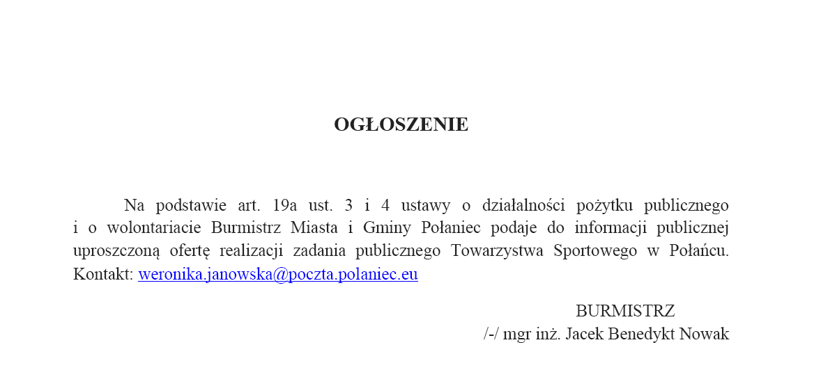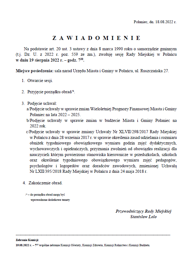Proszę Państwa ustawa z dnia 11 stycznia 2018 r. o zmianie niektórych ustaw w celu zwiększenia udziału obywateli w procesie wybierania, funkcjonowania i kontrolowania niektórych organów publicznych, nakłada na samorządy obowiązek transmisji, nagrywania i udostępniania nagrań obrad rady gminy,. Art. 20.1b ustawy o samorządzie gminnym stanowi, że obrady rady gminy są transmitowane i utrwalane za pomocą urządzeń rejestrujących obraz i dźwięk. Nagrania obrad są udostępniane w Biuletynie Informacji Publicznej i na stronie internetowej gminy oraz w inny sposób zwyczajowo przyjęty. W związku z powyższym podczas Sesji Rady Miejskiej odbywa się fotografowanie, filmowanie i rejestracja audio osób biorących w nich udział. Pozyskane w ten sposób materiały są eksploatowane na nośnikach lub publikowane w sieci Internet w celu transparentności działań Rady Miejskiej. Biorąc więc udział w Sesji Rady Miejskiej dana osoba musi być świadoma, iż przetwarza się jej wizerunek, tym samym akceptuje niniejsze warunki. Udział w publicznej Sesji Rady Miejskiej, czy wejście na teren obiektu, na którym odbywa się Sesja Rady Miejskiej, skutkuje rozpowszechnianiem wizerunku utrwalonego podczas obrad na podkreślonych polach eksploatacji tj., strona www.portal.polaniec.eu, BIP Urzędu Miasta i Gminy w Połańcu, kanał you tube oraz gazeta w celu transparentności działań Gminy.