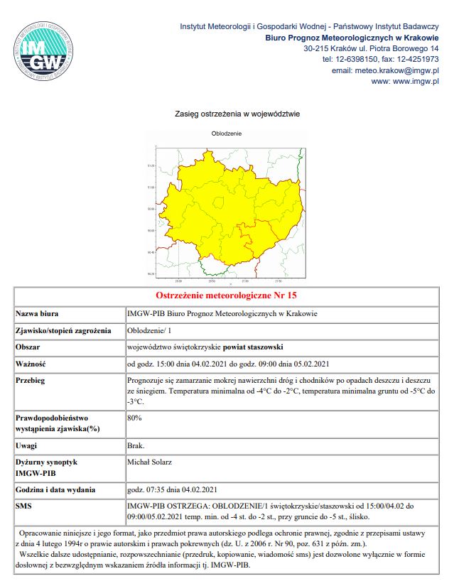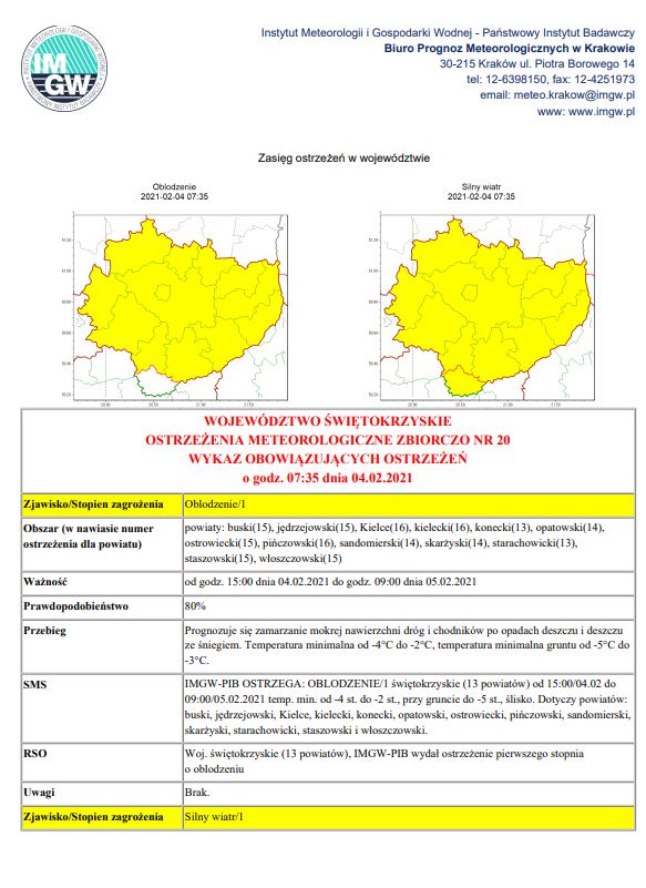 Prognozuje się również wystepowanie silnego wiatru od godz. 22:00 dnia 03.02.2021 r.