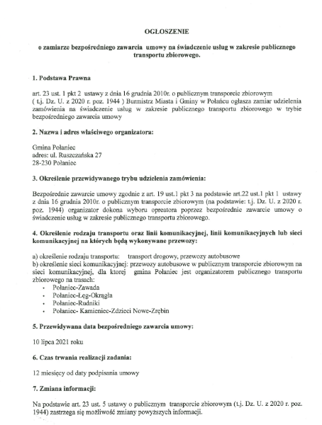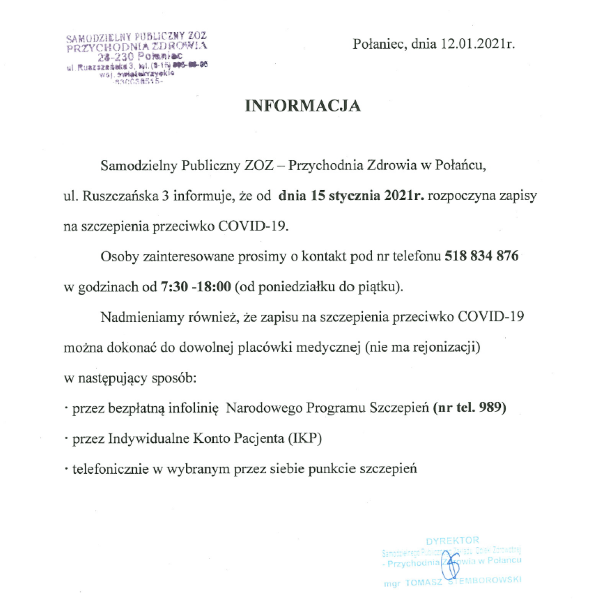 Miasto i Gmina Połaniec informuje, że w związku z otrzymanym w dniu dzisiejszym pismem ze Świętokrzyskiego Urzędu Wojewódzkiego w Kielcach do dnia 13 stycznia do godz. 12.00 przyjmowane będą drogą telefoniczną informacje dotyczące transportu osób mających trudności w samodzielnym dotarciu do punktów szczepień przeciwko wirusowi SARS –CoV – 2.