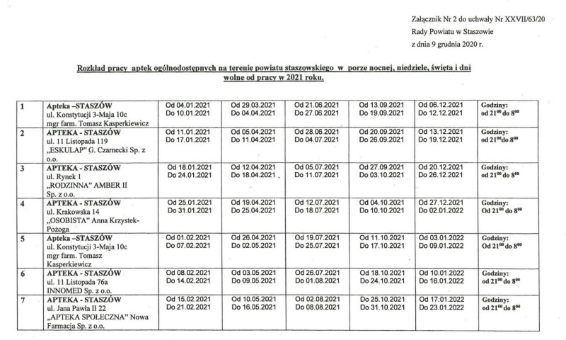 ROZKŁAD PRACY APTEK NA TERENIE POWIATU STASZOWSKIEGO
