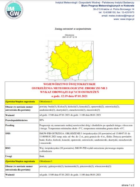 Grafika dotyczy ostrzeżenia meteorologicznego (zamarzanie mokrej nawierzchni) od godziny 15:00 w dniu 07.01. 2021 roku do godziny 11:00 dnia 08. 01.2021 roku.