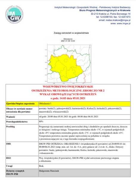 Grafika dotyczy ostrzeżenia meteorologicznego (zamarzanie mokrej nawierzchni) od godziny 20:00 w dniu 05.01.2021 roku do godziny 08:00 dnia 06.01.2021 roku.