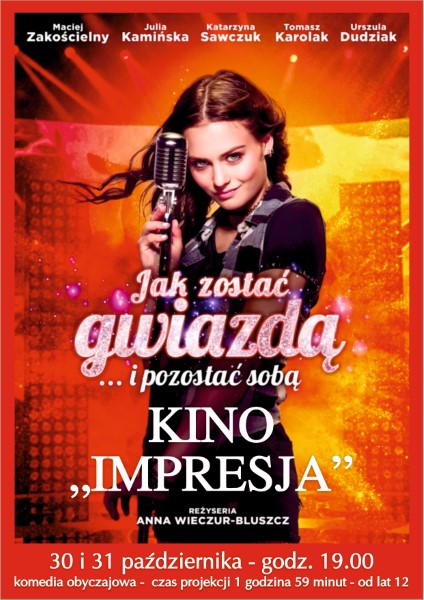 Jak to jest zostać gwiazdą i się nie zmienić? Na to pytanie poszukajmy odpowiedzi w kinie. Zapraszamy do Kina "Impresja" 30- 31.10 o godz. 19.00 na nową, polską komedię obyczajową "Jak zostać gwiazdą ..... I pozostać sobą"