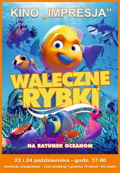 Dzieci i dorosłych zapraszamy w dniach 23 - 24.10 o godz. 17.00 do Kina "Impresja" na film animowany "Waleczne rybki"