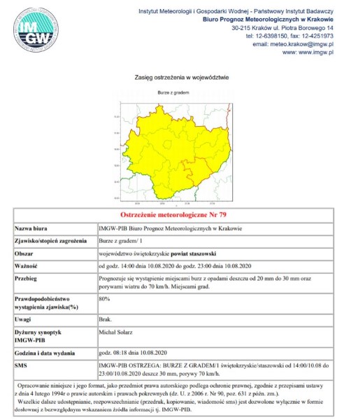 Otrzeżenie meteorologiczne dotyczące występowania zjawiska burz z gradem w dniu 17.08.2020 r.w godzinach od 12:00 do 21:30