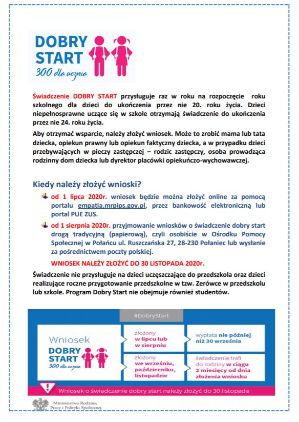 Wnioski na świadczenia z programu DOBRY START, można składać od 1 lipca 2020 r w formie elektronicznej oraz od 1 sierpnia 2020 r. w formie papierowej.