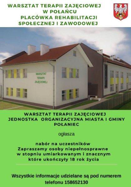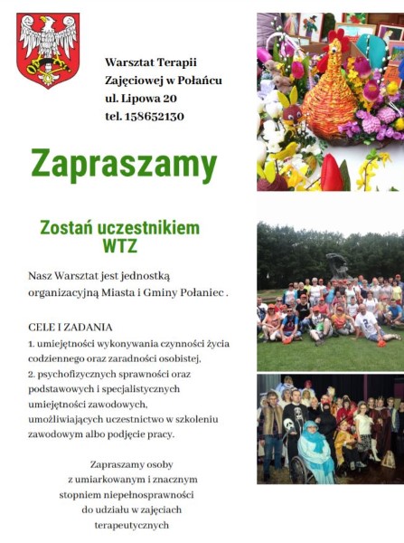 Grafika przedstawia zaproszenie do zostania uczestnikiem Warsztatu Terapii Zajęciowej w Połańcu oraz określa cele i zadania jednostki.