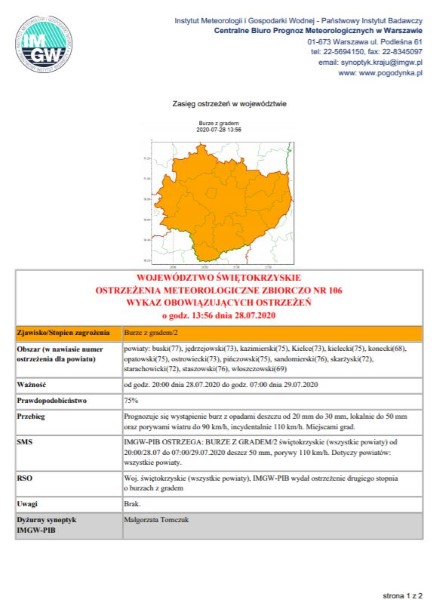 Grafika przedstawia Ostrzeżenie Meteorologiczne (burze z gradem - stopień zagrożenia 2) dla Województwa Świętokrzyskiego