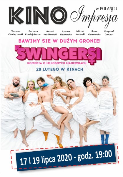 Grafika przedstawia zaproszenie kina "Impresja" w Połańcu na film "Swingersi". Film będzie można obejrzeć w dniach 17 i 19 lipca (piątek, niedziela) o godzinie 19:00.