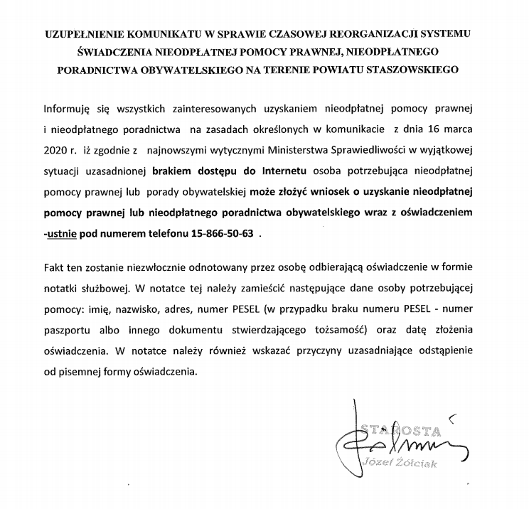 KOMUNIKAT W SPRAWIECZASOWEJ REOGANIZACJI SYSTEMU ŚWIADCZENIA NIEODPŁATNEJ USŁUGI PRAWNEJ, NIEODPŁATNEGO PORADNICTWA OBYWATELSKIEGO NA TERENIE POWIATU STASZOWSKIGO - PRACA RADCÓW PRAWNYCH, ADWOKATÓW I DORADCÓW OBYWATELSKICH NA ODLEGŁOŚĆ