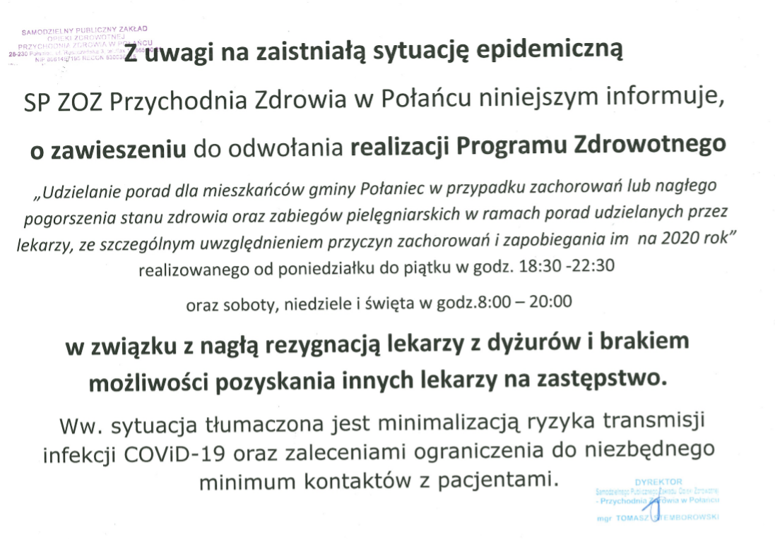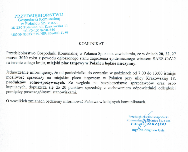 KOMUNIKAT BURMISTRZA MIASTA I GMINY POŁANIEC