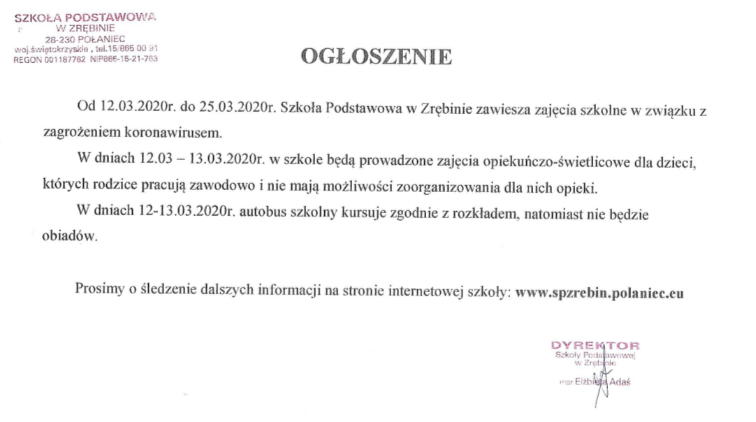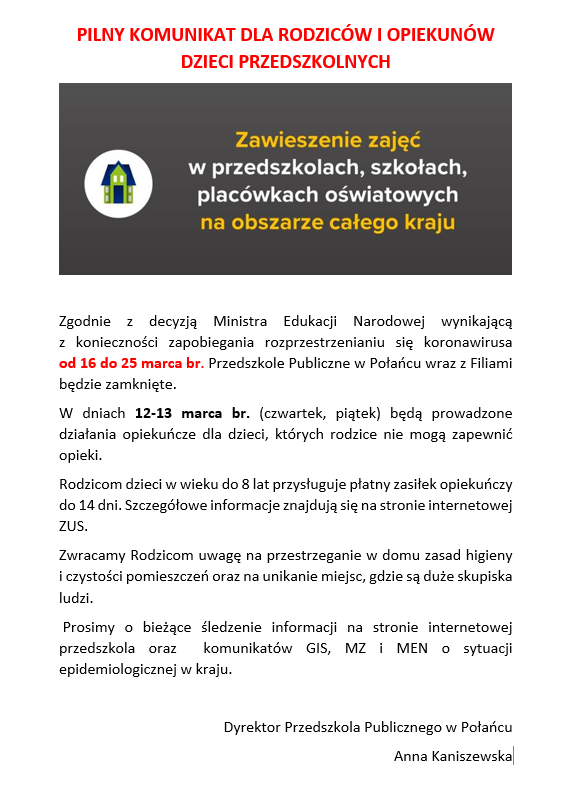 KOMUNIKAT - SZKOŁA PODSTAWOWA W POŁAŃCU