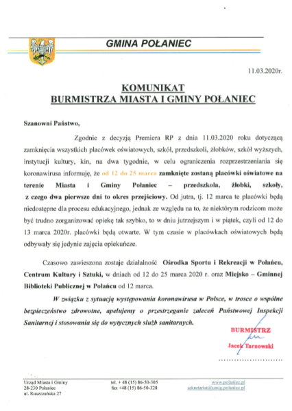 KOMUNIKAT BURMISTRZA MIASTA I GMINY POŁANIEC