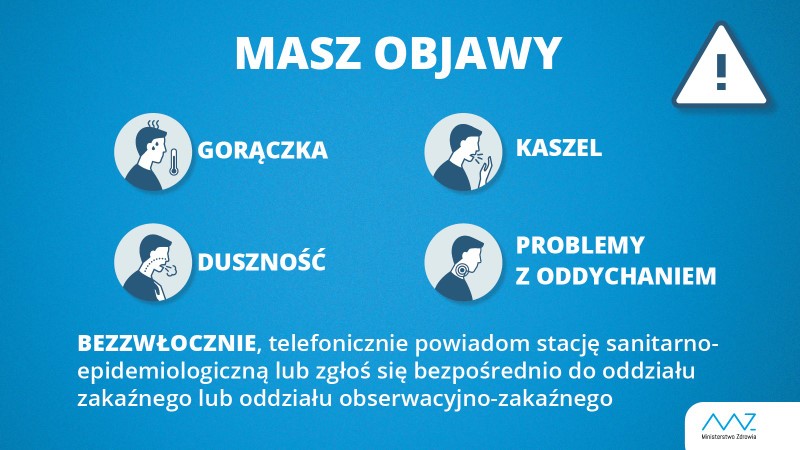 • Jeśli odczujesz u siebie, że masz gorączkę, skłonności do częstego kaszlu, trudności z oddychaniem oraz bóle mięśni – zasięgnij pomocy medycznej.
