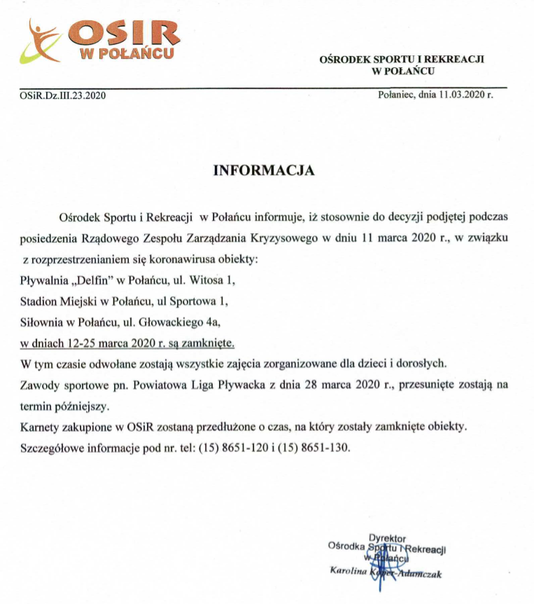 KOMUNIKAT - OŚRODEK SPORTU I REKREACJI