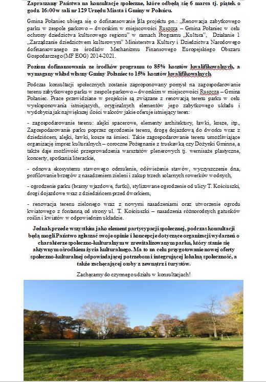 KONSULTACJE SPOŁECZNE - dotyczące ubiegania się przez Gminę dofinansowania dla projektu pn.: „Renowacja zabytkowego parku w zespole parkowo – dworskim w miejscowości Ruszcza – Gmina Połaniec w celu ochrony dziedzictwa kulturowego regionu”