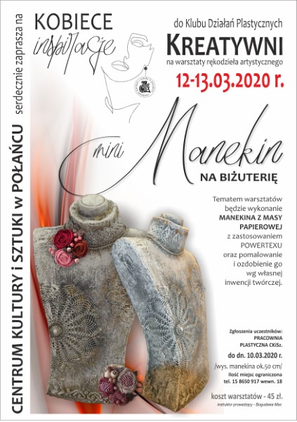 Zapraszamy do udziału w warsztatach rękodzieła artystycznego "Mini Manekin na biżuterię", które odbędą się w dniach 12 - 13 marca w godz. popołudniowych w CKiSz w Połańcu. Podczas warsztatów uczestnicy wykonają manekina z masy papierowej z zastosowaniem powertexu o wysokości 50 cm i ozdobią go według własnej inwencji twórczej. Zgłoszenia przyjmowane są w Pracowni Plastycznej CKiSz lub telefonicznie pod numerem 158650917 wew. 18 do dnia 10 marca. Koszt warsztatów to 45 zł.