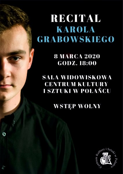 8 marca o godz. 18.00 serdecznie zapraszamy na recital wychowanka Centrum Kultury i Sztuki w Połańcu, Karola Grabowskiego. Karol od wielu lat odnosi sukcesy na scenie muzycznej kształcąc swoj kunszt wokalny pod okiem Pani Marzeny Drożdżowskiej. Śpiewa, gra na instrumentach i w spektaklach muzycznych. Podczas recitalu usłyszymy łagodne, nastrojowe utwory i mocne, dynamiczne brzmienie. Zapraszamy do spędzenia miłego wieczoru w towarzystwie muzyki.
