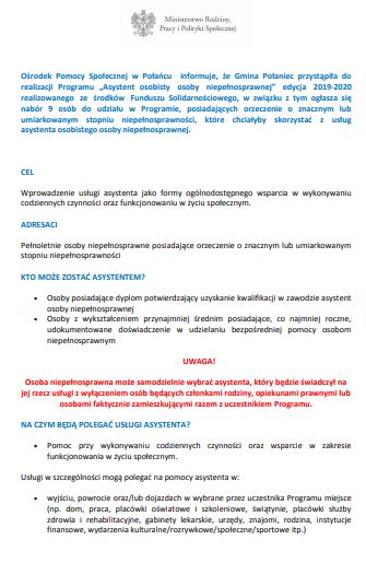 Ośrodek Pomocy Społecznej w Połańcu ogłasza nabór dla 9 osób do udziału w Programie "Asystent osobisty osoby niepełnosprawnej edycja 2019-2020 realizowanego ze środków Funduszu Solidarnościowego