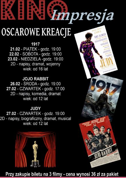 Zapraszamy do obejrzenia filmów nominowanych i nagrodzonych na tegorocznej Gali Oskarowej. Zachęcamy do zakupu biletu na trzy filmy w jednym pakiecie w cenie 36.00 zł.