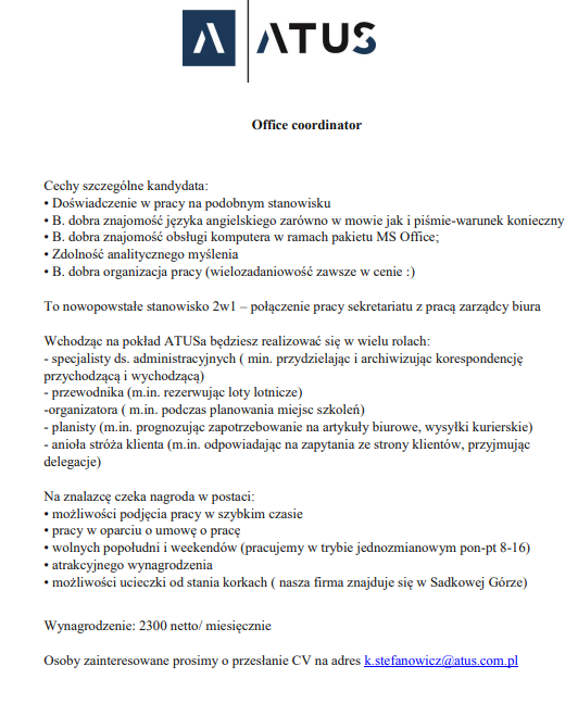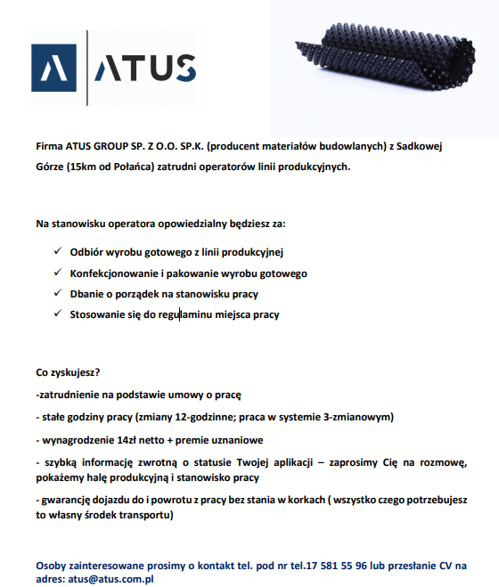 Ogłoszenie na stanowisko operatora linii produkcyjnej oraz na stanowisko administracyjne.