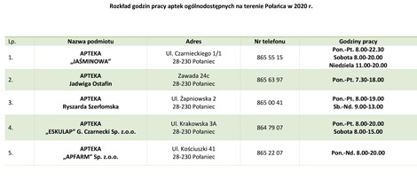 Rozkład godzin pracy aptek ogólnodostępnych na terenie Połańca w 2020 r.