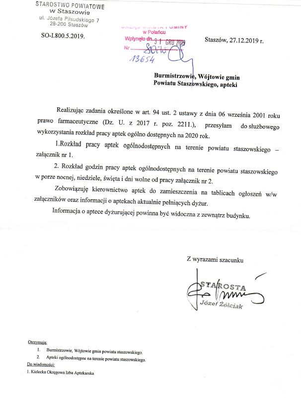 UCHWAŁA NR XVI/93/19 RADY POWIATU W STASZOWIE z dnia 12 grudnia 2019 r. w sprawie ustalenia rozkładu godzin aptek ogólnodostępnych na terenie powiatu staszowskiego w 2020 roku