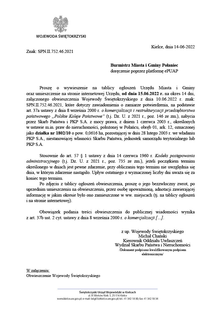 Działając na podstawie art. 35 ust. 1 ustawy z dnia 21 sierpnia 1997 roku o gospodarcenieruchomościami (j.t.Dz. U. 2021 r. poz. 1899 ze zm.)Burmistrz Miasta i Gminy Połaniec informuje, że poprzez wywieszenie w dniu 28 czerwca 2022 roku, na okres 21 dni, na tablicy ogłoszeń w Urzędzie Miasta i Gminy Połaniec przy ulicy Ruszczańskiej 27 został podany do publicznej wiadomościwykaz nieruchomości gruntowejpołożonej w Połańcu, oznaczonej w ewidencji gruntów jako działka nr 5881/67 o powierzchni 0,0039 ha przeznaczonej do sprzedaży w trybie bezprzetargowym na rzecz jej użytkownika wieczystego. Wykaz ten został także zamieszczony na stronach internetowych Urzędu Miasta i Gminy Połaniec: polaniec.bip.gov.pl oraz www.portal.polaniec.eu.