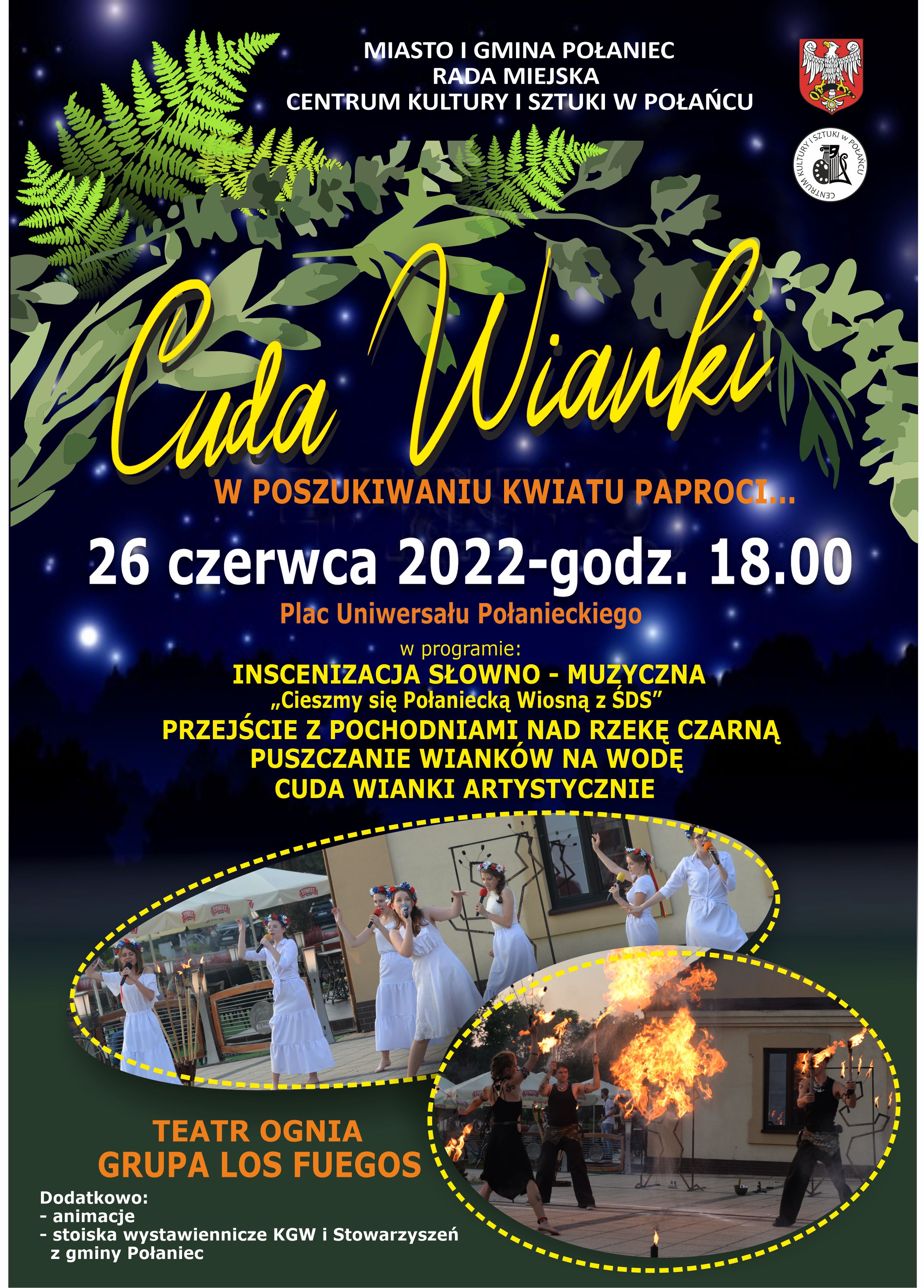 Noc świętojańska zwana sobótką to święto ognia i wody. Co roku Centrum Kultury i Sztuki w Połańcu przypomina o wierzeniach przodków, próbując stworzyć namiastkę tego nieco zapomnianego i tajemniczego świata. 26 czerwca o godz. 18.00 zapraszamy na Plac Uniwersału Połanieckiego na Cuda Wianki .... w poszukiwaniu kwiatu paproci - spotkanie w klimacie nocy świętojańskiej. Nie zabraknie folkowej muzyki, ludowych przyśpiewek, tańca z ogniem i tradycyjnego puszczania wianków na wodę ….