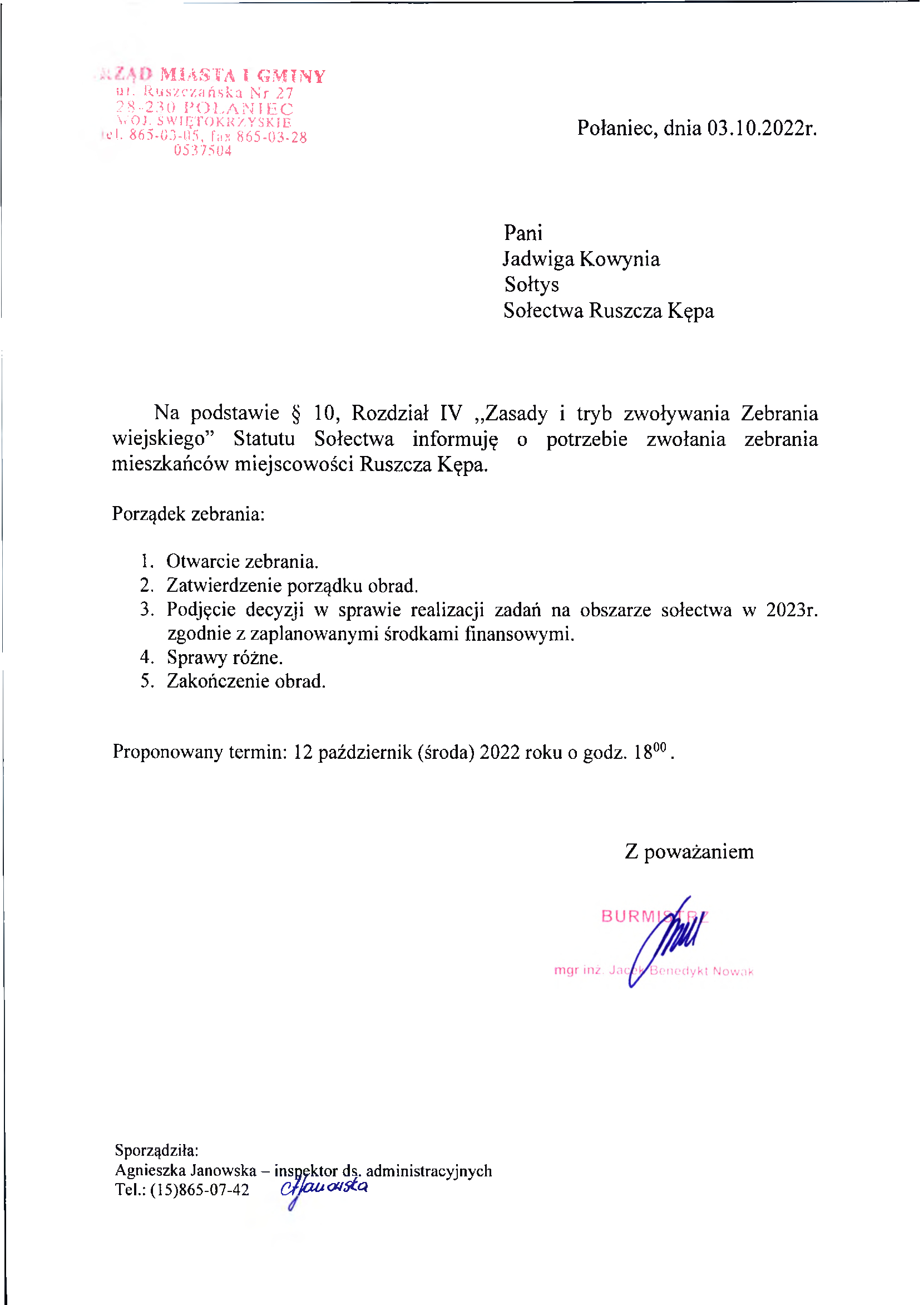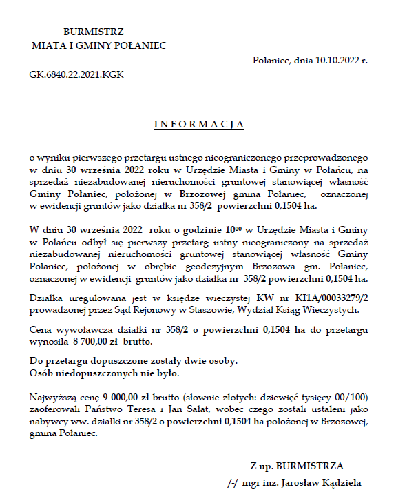 W dniu dzisiejszym ( 06.10.2022 r.) w budynku Miasta i Gminy została zawarta umowa pomiędzy gminą Połaniec reprezentowaną przez Jarosława Kądzielę – Zastępcę Burmistrza a Panem Łukaszem Bogaczem prowadzącym działalność gospodarczą pod firmą BOGITECH ŁUKASZ BOGACZ.