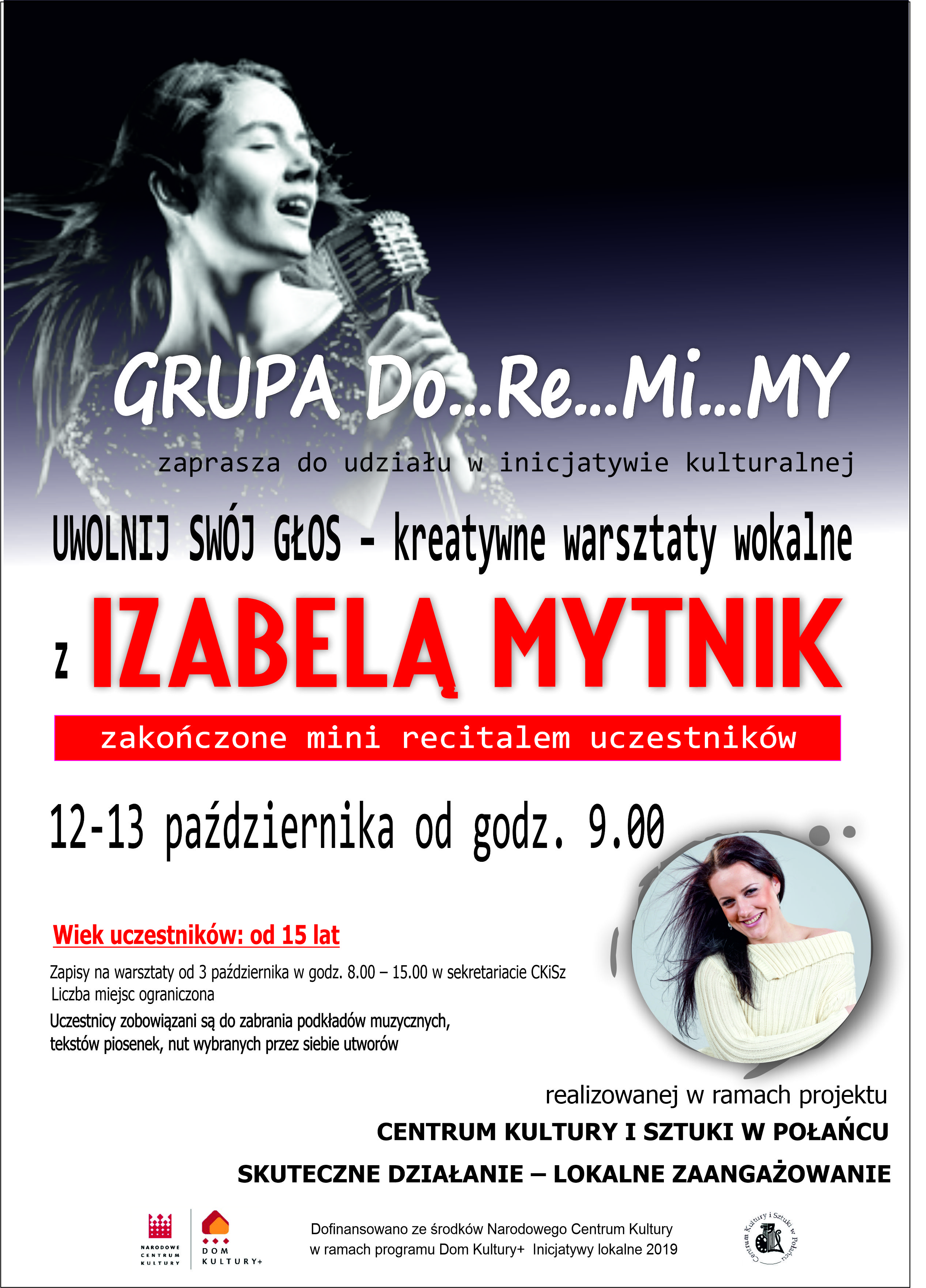 Zapraszamy na kolejne warsztaty wokalne, które poprowadzi Izabela Mytnik, wokalistka, trener wokalny, akordeonistka, autorka tekstów i muzyki. Warsztaty odbędą się z inicjatywy kulturalnej "UWOLNIJ SWÓJ GŁOS - kreatywne warsztaty wokalne" realizowanej przez Grupę Do...Re...Mi...MY w ramach projektu Centrum Kultury i Sztuki w Połańcu "SKUTECZNE DZIAŁANIE - LOKALNE ZAANGAŻOWANIE" dofinansowanego z programu Dom Kultury + Inicjatywy Lokalne 2019.