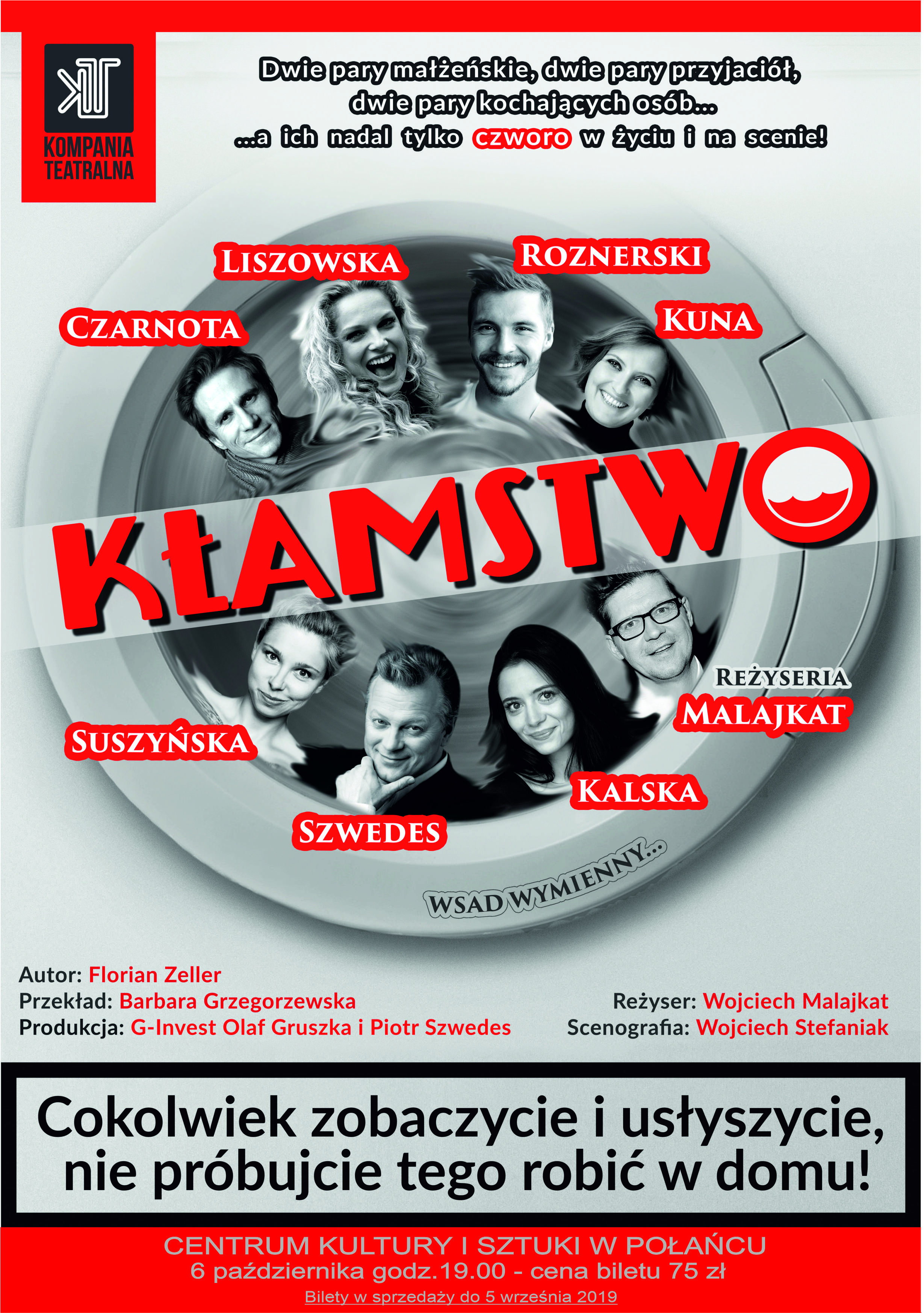 KŁAMSTWO” to niesamowite i przenikliwe, a przy tym, o zgrozo, zabawne studium, właśnie... kłamstwa. Florian Zeller, francuski dramaturg zdążył już przyzwyczaić swoich widzów do ostrej jazdy i bolesnego telemarku, porusza się z gracją baletnicy i precyzją chirurga w meandrach i zakamarkach ludzkich umysłów. Dwie pary małżeńskie, dwie pary przyjaciół, dwie pary kochanków, a ich nadal tylko czworo, jak to jest możliwe? Autor wie sporo o związkach damsko-męskich. Ktoś mógłby powiedzieć, a kto nie wie? On jednak umiejętnie i prowokacyjnie przełożył to na słowa... Słowa, które tną. Jak brzytwa. A tonący?... No właśnie.