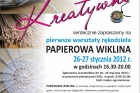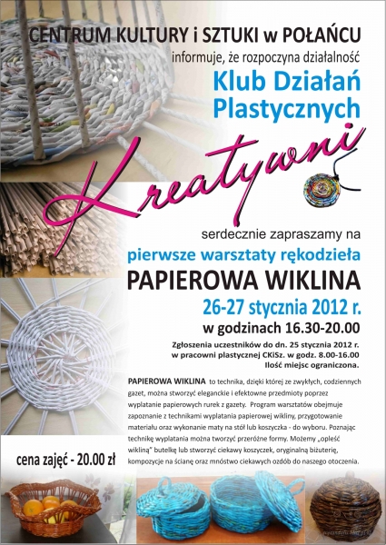 Zaczynamy 26 - 27 stycznia, od godz. 16.30 do 20.00, warsztatami z PAPIEROWEJ WIKLINY. Nauczymy jak ze zwykłej gazety można stworzyć przyjemne dla oka ozdoby i najróżniejsze przedmioty.