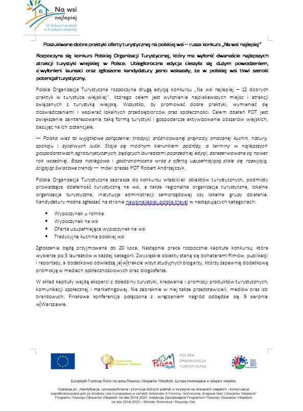 "Na wsi najlepiej - 12 dobrych praktyk w turystyce wiejskiej" - rusza druga edycja konkursu POT