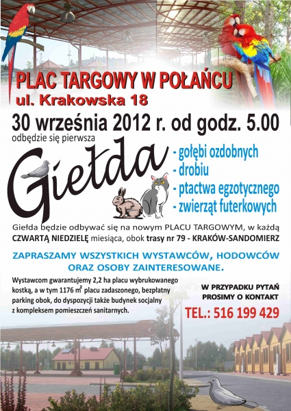 30 września odbędzie się giełda gołębi ozdobnych, drobiu, ptactwa egzotycznego i zwierząt futerkowych. Giełda odbywać się będzie w każdą czwartą niedzielę miesiąca.