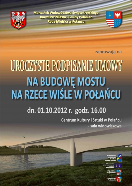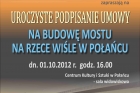 Marszałek Województwa Świętokrzyskiego – Adam Jarubas, Burmistrz Miasta i Gminy Połaniec – Jacek Tarnowski i Przewodniczący Rady Miejskiej – Stanisław Lolo z radnymi zapraszają mieszkańców na uroczysty akt podpisania umowy na realizację zadania inwestycyjnego – Budowa mostu na rzece Wiśle.