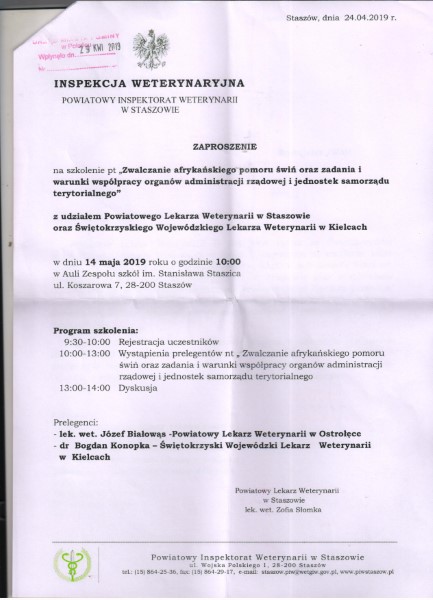 Powiatowy Inspektorat Weterynarii w Staszowie zaprasza na szkolenie