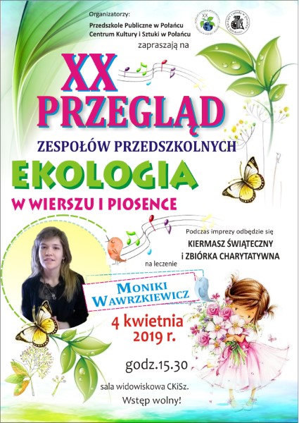 W najbliższy czwartek 4 kwietnia 2019r w połanieckim Centrum Kultury i Sztuki odbędzie się jubileuszowy XX Przegląd Zespołów Przedszkolnych „Ekologia w Wierszu i Piosence”. Honorowym patronatem to wydarzenie objęli: Andrzej Bętkowski Marszałek Województwa Świętokrzyskiego oraz Kazimierz Mądzik Świętokrzyski Kurator Oświaty. Swoją obecność na tej imprezie zapowiedział Prezes Państwowego Gospodarstwa Wodnego Wód Polskich Przemysław Daca.