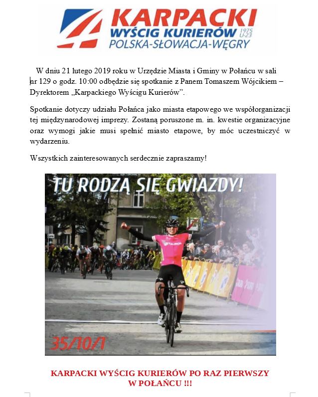 Karpacki Wyścig Kurierów to kolarski wyścig wieloetapowy, który od wielu lat zapisany jest w tradycji Polski. Prócz naszego kraju wyścig ten rozgrywany jest na Słowacji i na Węgrzech. W tym roku i nasze miasto Połaniec zapisze się na kartach historii Wyścigu Kurierów. Pierwszego maja kolarze zawitają na naszych terenach, skąd rozpoczną kolejny etap zmagań. Dwudziestego pierwszego lutego w Urzędzie Miasta i Gminy Połaniec odbyło się spotkanie władz gminy z Panem Tomaszem Wójcikiem, Dyrektorem Wyścigu i Anną Przybyłowicz. Na spotkaniu obecni byli m.in. przedstawiciele służb mundurowych, Pani Dyrektor Centrum Kultury i Sztuki w Połańcu, Pani Dyrektor Ośrodka Sportu i Rekreacji, kierownicy Urzędu Miasta i Gminy w Połańcu, pracownicy oraz wszyscy zainteresowani. Po krótkiej prezentacji historii Karpackiego Wyścigu Kurierów Pan Dyrektor przedstawił wstępne założenia organizacyjne i zarys przebiegu wyścigu przez Połaniec. Niewątpliwie będzie to niecodzienne wydarzenie dla naszej gminy, które posłuży nie tylko promocji naszych regionów ale zapewni mieszkańcom mnóstwo atrakcji. Pierwszy maj to również dni Połańca także połączenie tych wszystkich wydarzeń to gwarancji świetnej zabawy i mnóstwa emocji, które czekać będą dla wszystkich mieszkańców gminy oraz przyjezdnych gości.