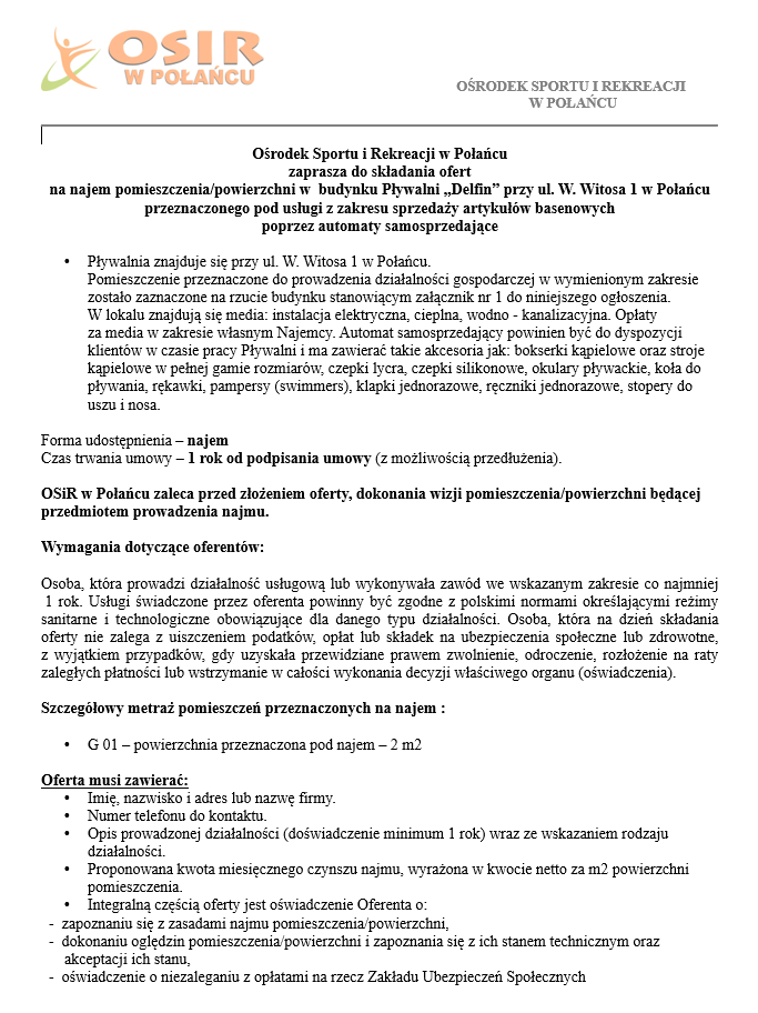 Ośrodek Sportu i Rekreacji w Połańcu zaprasza do składania ofert
