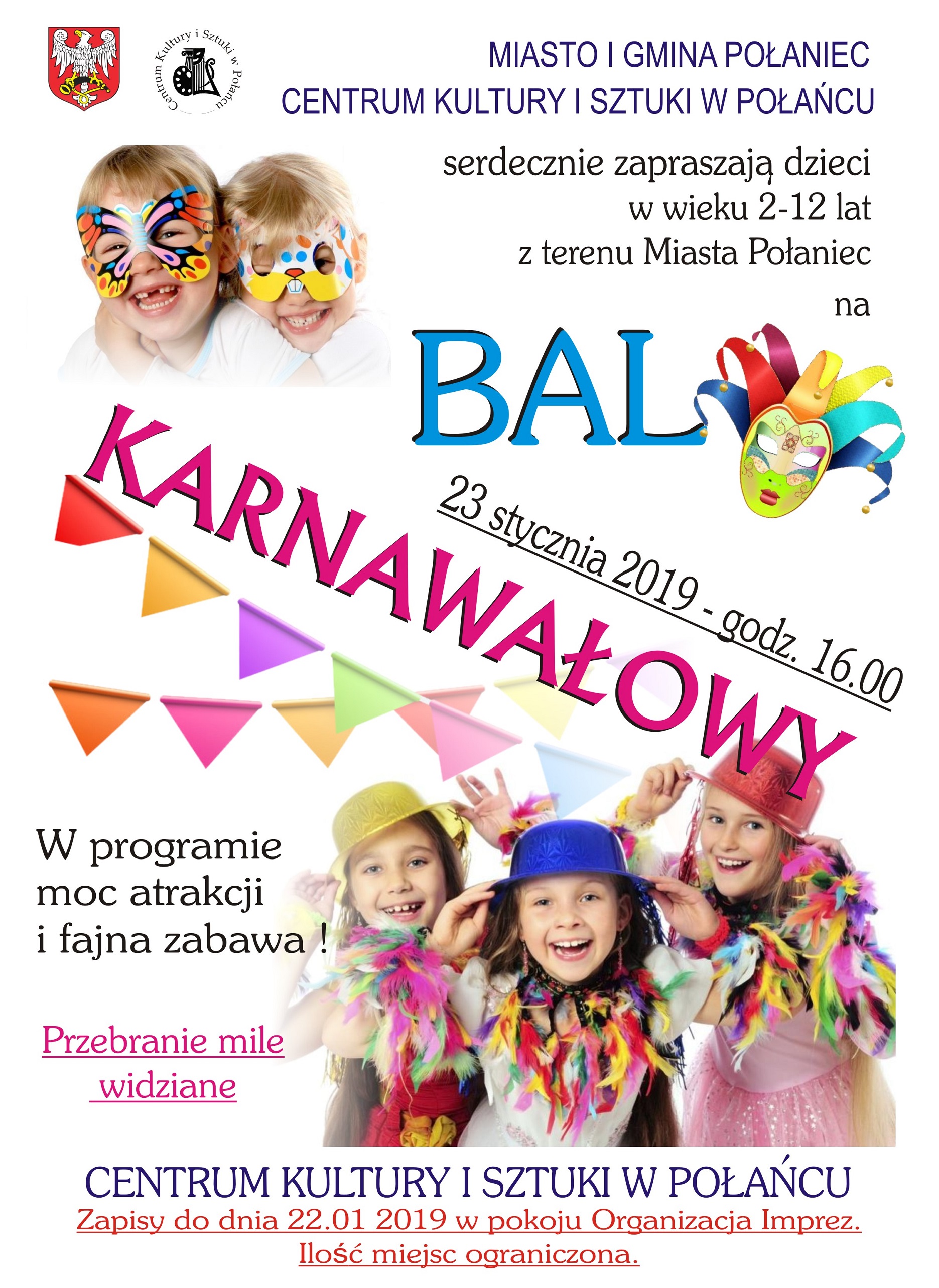 Zapraszamy dzieci z terenu Miasta Połaniec 23 stycznia o godz. 16.00 na Bal Karnawałowy w Centrum Kultury i Sztuki w Połańcu.Przebranie i dobry humor mile widziane..... Zapisy w dniach: 16.01 - 22.01 w pokoju Organizacja Imprez CKiSz.