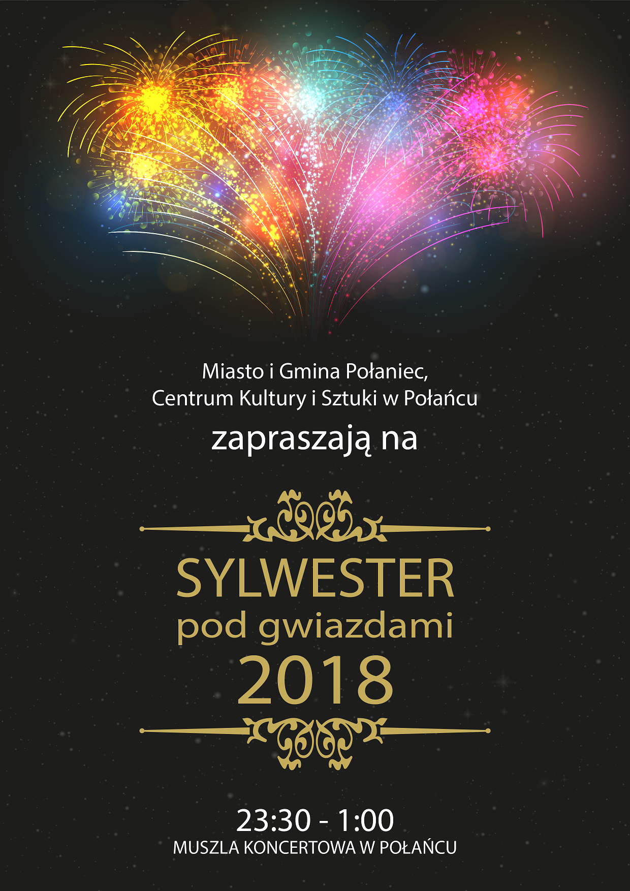 Przed nami jedyna w roku, niepowtarzalna noc. Znakomite towarzystwo, wspaniała zabawa i dobra muzyka to nieodłączne jej atrybuty. Zachęcamy do spędzenia wieczoru sylwestrowego na muszli koncernowej w Połańcu. Dokładnie o godz. 23.30 zabrzmi energetyczna, "sylwestrowa muzyka". Będzie głośno, gorąco i dyskotekowo. Jak co roku będą życzenia noworoczne dla wszystkich mieszkańców i gości. Tradycyjnie o północy niebo rozświetli feeria barw pokazu pirotechnicznego. Sylwestrowo - muzyczne spotkanie zakończymy około godz. 1.00. Warto ten wyjątkowy wieczór spędzić z nami. A zapraszają organizatorzy: Miasto i Gmina Połaniec i Centrum Kultury i Sztuki w Połańcu.