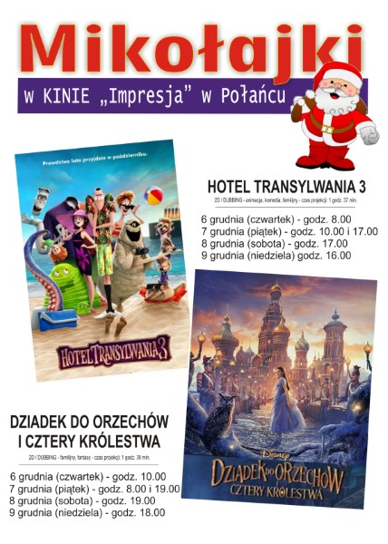 Wkrótce ulubiony dzień wszystkich dzieciaków (i nie tylko). Już dziś odliczamy dni do MIKOŁAJA. Kino "Impresja" zaprasza dzieci, młodzież i dorosłych na MIKOŁAJKI W KINIE z bohaterami "Hotelu Transylwania 3" i "Dziadka do orzechów"... Zapraszamy :)