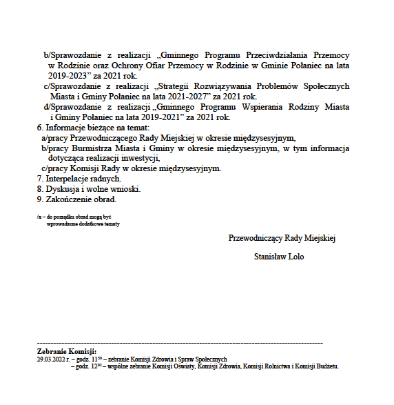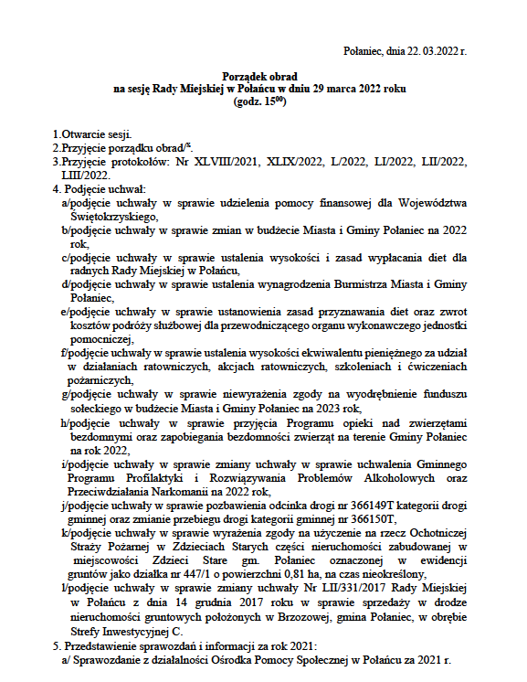 Proszę Państwa ustawa z dnia 11 stycznia 2018 r. o zmianie niektórych ustaw w celu zwiększenia udziału obywateli w procesie wybierania, funkcjonowania i kontrolowania niektórych organów publicznych, nakłada na samorządy obowiązek transmisji, nagrywania i udostępniania nagrań obrad rady gminy,. Art. 20.1b ustawy o samorządzie gminnym stanowi, że obrady rady gminy są transmitowane i utrwalane za pomocą urządzeń rejestrujących obraz i dźwięk. Nagrania obrad są udostępniane w Biuletynie Informacji Publicznej i na stronie internetowej gminy oraz w inny sposób zwyczajowo przyjęty. W związku z powyższym podczas Sesji Rady Miejskiej odbywa się fotografowanie, filmowanie i rejestracja audio osób biorących w nich udział. Pozyskane w ten sposób materiały są eksploatowane na nośnikach lub publikowane w sieci Internet w celu transparentności działań Rady Miejskiej. Biorąc więc udział w Sesji Rady Miejskiej dana osoba musi być świadoma, iż przetwarza się jej wizerunek, tym samym akceptuje niniejsze warunki. Udział w publicznej Sesji Rady Miejskiej, czy wejście na teren obiektu, na którym odbywa się Sesja Rady Miejskiej, skutkuje rozpowszechnianiem wizerunku utrwalonego podczas obrad na podkreślonych polach eksploatacji tj., strona www.portal.polaniec.eu, BIP Urzędu Miasta i Gminy w Połańcu, kanał you tube oraz gazeta w celu transparentności działań Gminy.