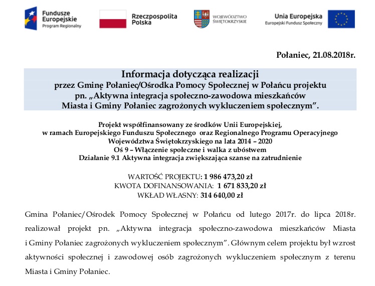 Zakończono realizację rocznego projektu pn. „Aktywna integracja społeczno-zawodowa mieszkańców Gminy Połaniec zagrożonych wykluczeniem społecznym”