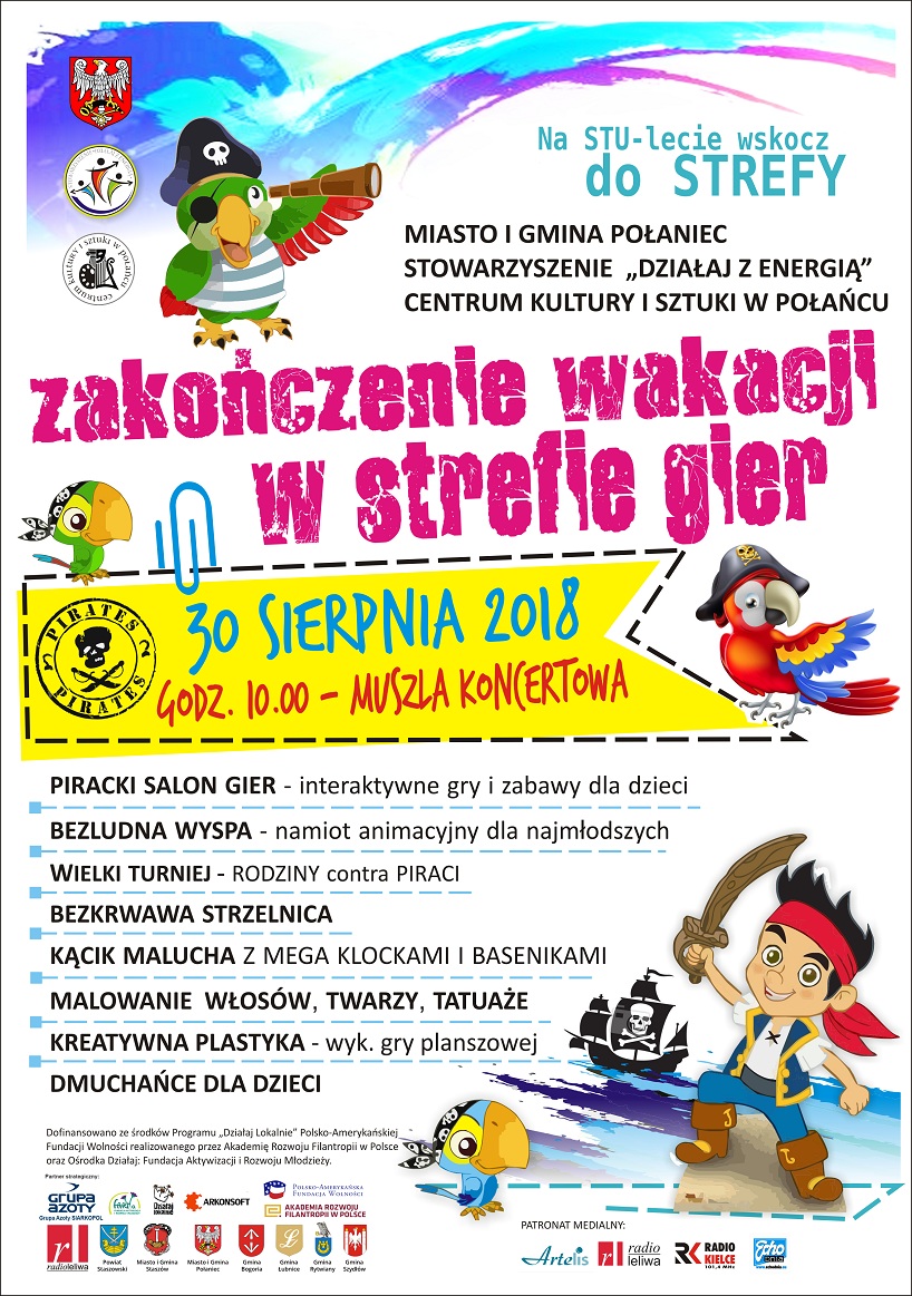 "Na STU lecie wskocz do STREFY" ..... Tym hasłem zachęcamy dzieci, młodzież i dorosłych do aktywnego spędzenia czasu w STREFIE GIER na muszli koncertowej w Połańcu. 30 sierpnia zakończymy wakacje wśród interaktywnych gier, zabaw i pirackich konkurencji. Salon Gier, Kącik Malucha, Kreatywna Plastyka to tylko część z przygotowanych atrakcji.
